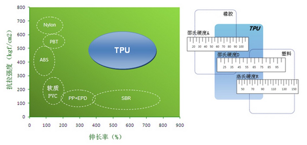 TPU的主要特性有: 硬度范圍廣:通過改變TPU各反應(yīng)組分的配比,可以得到不同硬度的產(chǎn)品,而且隨著硬度的增加,其產(chǎn)品仍保持良好的彈性和耐磨性。 機(jī)械強(qiáng)度高:TPU制品的承載能力、抗沖擊性及減震性能突出。 耐寒性突出:TPU的玻璃態(tài)轉(zhuǎn)變溫度比較低,在零下35度仍保持良好的彈性、柔順性和其他物理性能。 加工性能好:TPU可采用常見的熱塑性材料的加工方法進(jìn)行加工,如注塑、擠出、壓延等等。同時(shí),TPU與某些高分子材料共同加工能夠得到性能互補(bǔ)的聚合物合金。 耐油、耐水、耐霉菌。 再生利用性好。